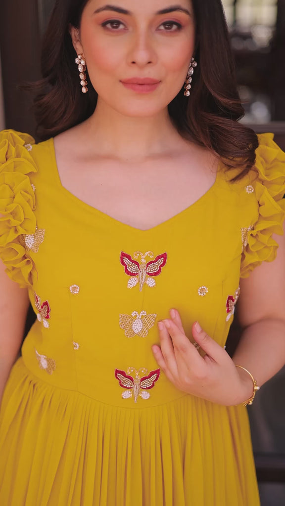 GOWN FABRIC & WORK :- Faux Blooming With Sequins Multithreaded Beads Embroidered work.